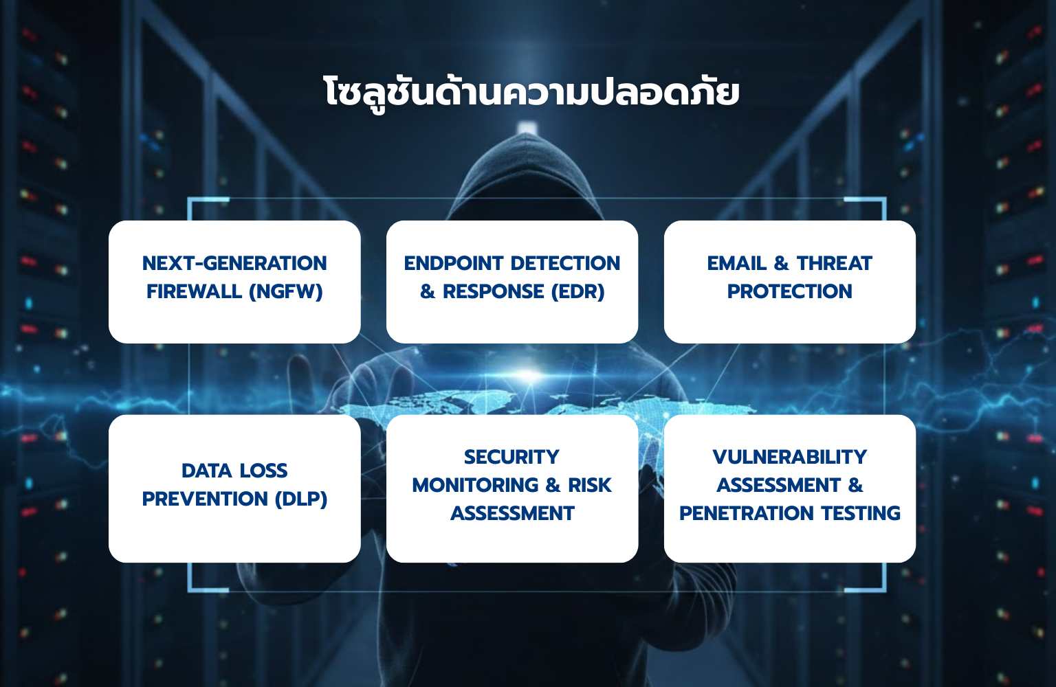 ระบบความปลอดภัยไซเบอร์สำหรับองค์กรระดับองค์กรขนาดใหญ่ในยุคที่ภัยคุกคามไซเบอร์มีความซับซ้อนมากขึ้น เราพัฒนาและติดตั้งระบบ Cybersecurity แบบ Multi-Layer Protection เพื่อปกป้องข้อมูล ทรัพย์สินดิจิทัล และระบบสำคัญขององค์กร