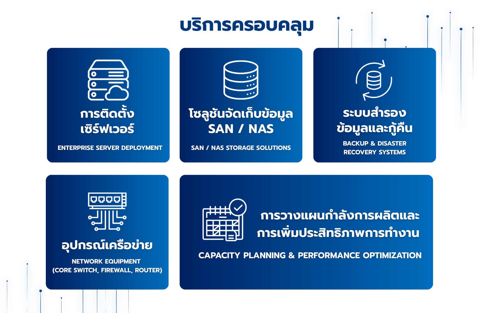 ออกแบบและพัฒนา IT Infrastructure และ Cybersecurity Solutions สำหรับองค์กรขนาดใหญ่ที่ต้องการความมั่นคง เสถียรภาพ และความปลอดภัยสูงสุด ครอบคลุมตั้งแต่การวางสถาปัตยกรรมระบบ (IT Architecture Design), Cloud & IaaS, Enterprise Server, Data Center ไปจนถึงระบบความปลอดภัยไซเบอร์แบบครบวงจรรองรับธุรกิจที่ต้องการโครงสร้างพื้นฐานที่ “พร้อมขยายตัว” และ “พร้อมรับมือความเสี่ยง” ในทุกสถานการณ์